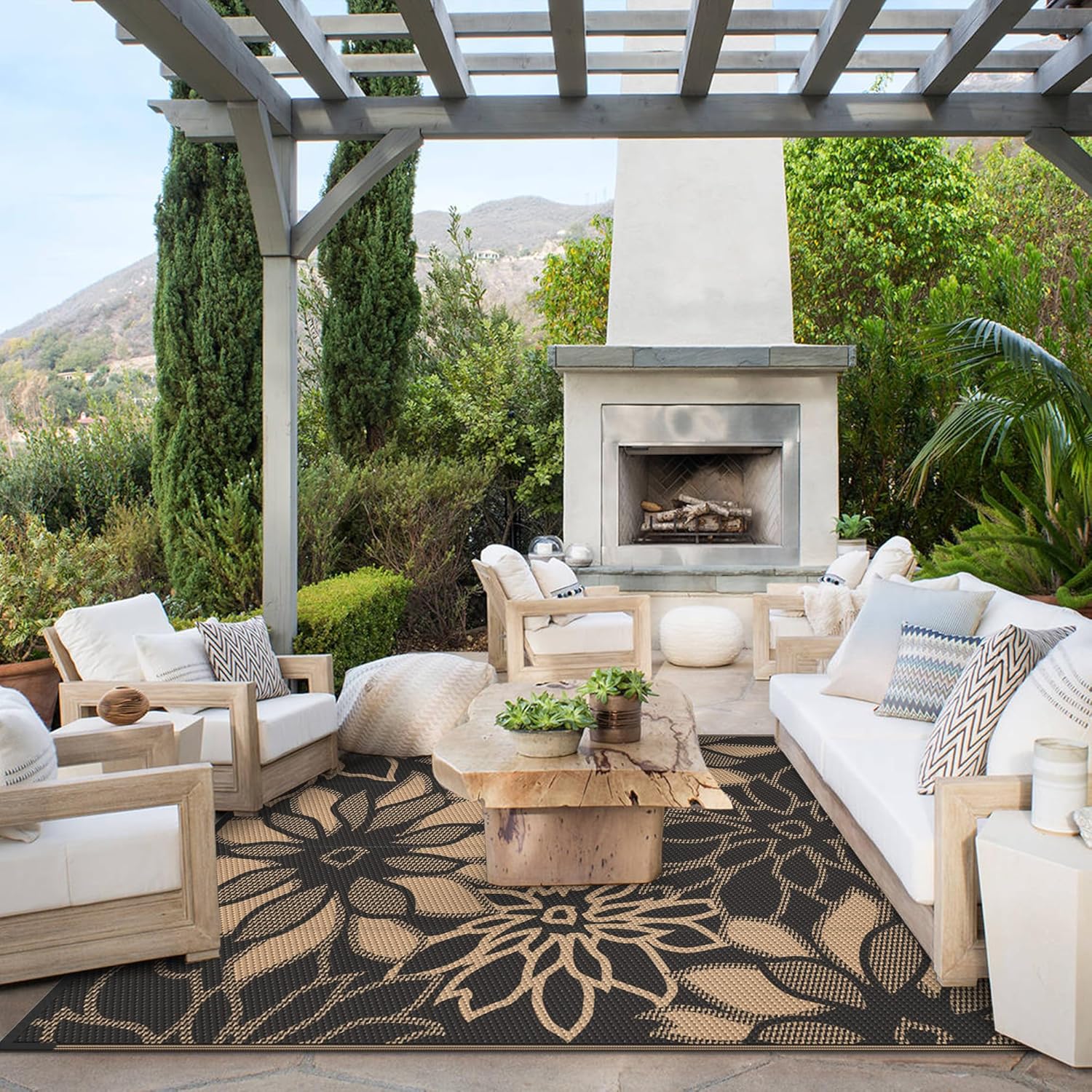 Featuring a generous size of 5′ x 8′, this reversible plastic straw rug is not only durable but also incredibly versatile. The elegant floral design in black and brown adds a touch of sophistication to your outdoor decor, making it ideal for RVs, campers, balconies, porches, and more.